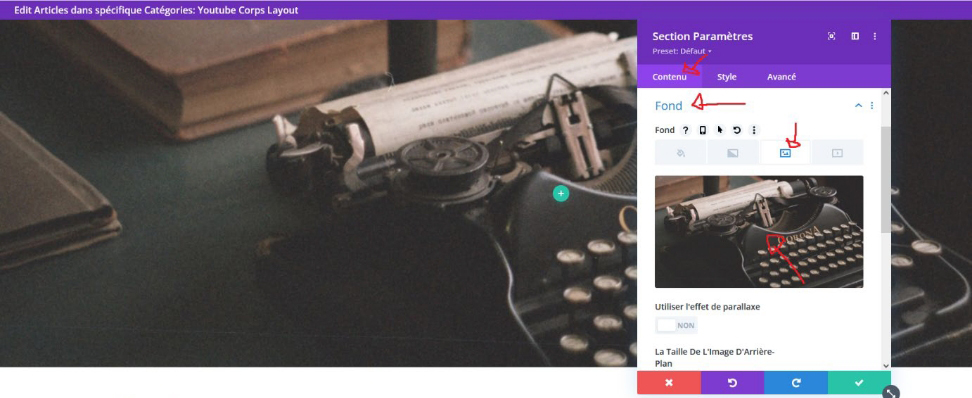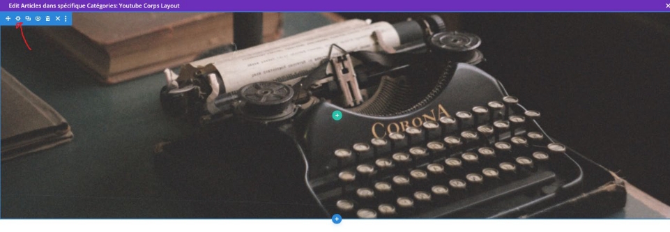 Si vous voulez, par exemple, changer une bannière (image de fond), il faut cliquer sur les paramètres de la section (bleu) où il y a l’image