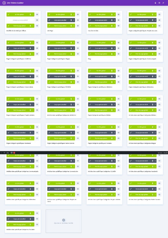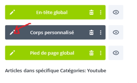 Pour faire des modifications aux éléments global tel que les articles de blogue, les produits ou les catégories, il faut cliquer sur le petit crayon de la partie Corps personnalisé (en gris), ne toucher pas aux En-tête global (Header global) et Pied de page global (footer global) (en vert), puisqu’il est global à TOUT LE SITE