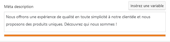 C’est donc à cet endroit que l’on peut modifier la métadescription, on peut simplement entrer son texte à la main ou utiliser des variable en cliquant sur insérez une variable. Comme c’est le cas sur la photo si haut où le titre du site est généré automatiquement à l’aide de la variable Titre du site (en magenta).