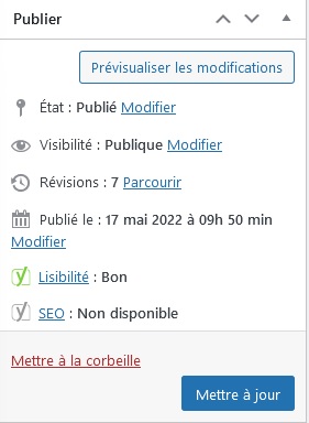 Une fois le titre (et la méta description que nous allons voir plus bas) ajouté, il suffit de cliquer sur publier ou mettre à jour (présent plus haut dans la page) pour sauvegarder le tout !