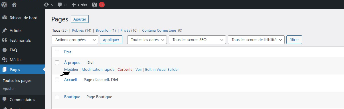 Pour ajouter un titre SEO à votre page, article, catégorie ou produit, il faut aller premièrement la modifier dans le tableau de bord de WordPress.