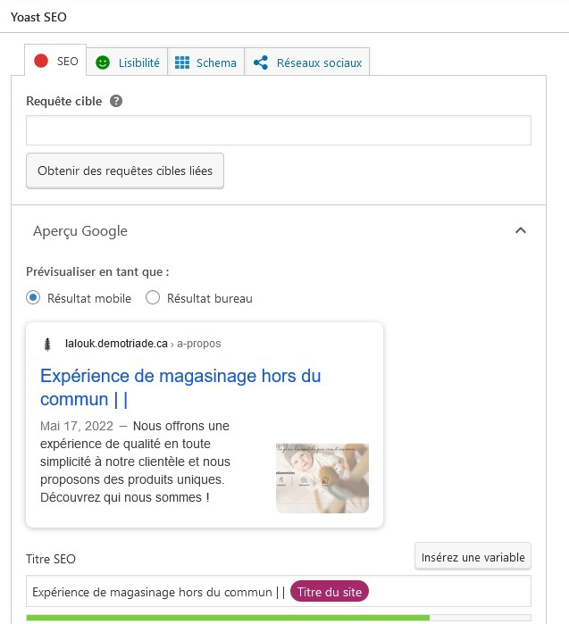 C’est donc à cet endroit que l’on peut modifier le titre SEO, on peut simplement entrer son texte à la main ou utiliser des variables en cliquant sur insérez une variable. Comme c’est le cas sur la photo si haut où le titre du site est généré automatiquement à l’aide de la variable Titre du site (en magenta).